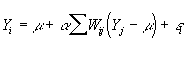 Le modèle (Figure 2 ) ne peut pas être estimé par un moindre carré ordinaire (MCO). D'une part, on se trouve face à un système d'équations simultanées dans lequel , par exemple, la mortalité est à la fois variable explicative de l'hospitalisation et dépendante des facteurs sociaux . Par ailleurs, les variables sont toutes affectées d'autocorrélation spatiale ce qui provoquerait une sur-estimation de la précision des estimateurs (dans le cas d'autocorrélation positive) via un MCO . Les modèles autorégressifs simultanés s'efforcent de purger des Y (variables dépendantes ) et X (variables indépendantes) l'autocorrélation spatiale en considérant toute observation comme étant une combinaison linéaire des observations contiguës (matrice de contiguïté Wij) sous la forme