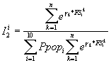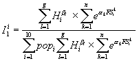 L'indice relatif de besoin de l'arrondissement i est le rapport entre l'indice de besoin de l'arrondissement i (soit le numérateur de Equation 3) et l'indice global de besoins tous arrondissements confondus (dénominateur) . Le numérateur est le produit des indice de besoins de santé (soit les Hl, soit le taux de mortalité et la surcharge pondérale)et des facteurs socio-économiques (les FSk). Ces variables (H et FS) sont pondérées par le coefficient les reliant à l'utilisation des services (hospitalisation), respectivement les b et les a dans l'équation antérieure . Ces coefficients sont tirés des résultats LISREL du modèle de la Figure 2 sur les 589 communes belges . Les résultats sont présentés dans la Figure 5. Les coefficients b sont, pour chacune des variables de santé, la somme de l'effet direct (flèche 2 dans la Figure 2) de la mortalité sur l'utilisation des services et de l'effet indirect (flèche 3 * flèche 5) . Les coefficients a correspondent à la flèche 4 de la même figure. On pratique, le modèle intègre deux variables de santé (g=2) et trois facteurs socio-économiques (n=3) . Etant donné que les variables sont prises en base logarithme, les poids sont utilisés en exposant. Popi est le poids relatif de la population relevant de la CLPS i .