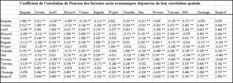 - Le tableau suivant produit les coefficients de Moran conjointement avec diverses statistiques permettant d'apprécier leur précision . Les variables apparaissent par ordre décroissant de I .